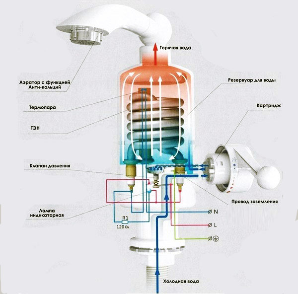 Τρεχούμενο νερό εισέρχεται στη δεξαμενή, η οποία περιέχει ισχυρά θερμαντικά στοιχεία. Η ισχύς θέρμανσης συνήθως εξαρτάται από τον ρυθμό ροής του νερού και εξασφαλίζει μια συνεχή παροχή νερού που θερμαίνεται στους 40-60 ° C στην έξοδο. Όλα τα στοιχεία του θερμαντήρα βρίσκονται σε ένα ενιαίο περίβλημα, το οποίο είναι ενσωματωμένο σε ντουλάπια τοίχου ή τοποθετημένο στον τοίχο.