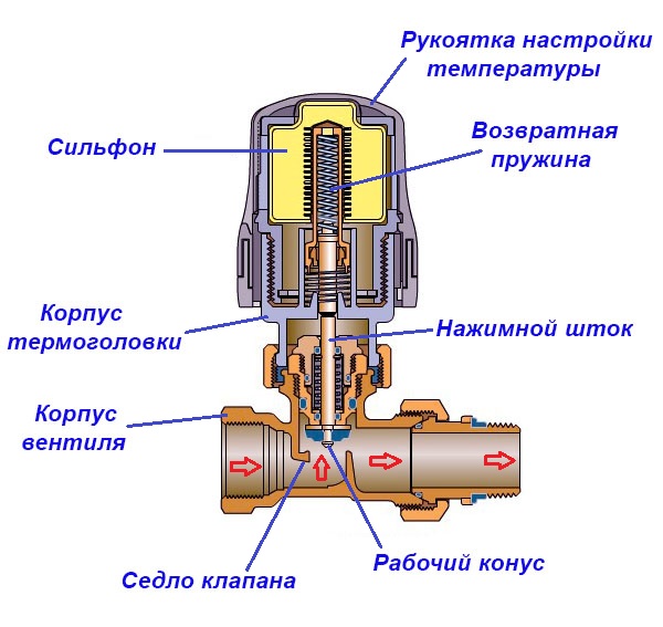 يوجد داخل الرأس الثرموستاتي حاوية صغيرة محكمة الغلق مملوءة بوسط حساس لدرجة الحرارة – سائل أو غاز. عند تسخينها ، يتمدد هذا الوسط ، ويزداد الحاوية ويضغط بقوة أكبر على الجذع ، مما يمنع تدفق المبرد. عند التبريد ، تسير العملية في الاتجاه المعاكس ، وهو مبدأ تشغيل الرأس الحراري. يحد مقبض الضبط المتدرج ميكانيكيًا من الحد الأقصى لفتح الصمام.