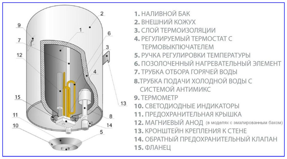 Kertyvä. Tämän tyyppisten kattiloiden rakenne on eri tilavuuksinen säiliö, jonka sisällä on lämmityselementti. Säiliöiden vesi on jatkuvasti lämmitetyssä tilassa, kun vettä kulutetaan, säiliö tyhjennetään ja täytetään samanaikaisesti – tämän avulla voit käyttää välittömästi suuria määriä vettä, mikä lisää asumismukavuutta. Varastointilämmittimet eivät myöskään vaadi suurta tehoa toimintaansa, ja minkä tahansa tilavuuden säiliöissä on lämpöä eristävä ulkokuori, joka vähentää lämpöhäviötä ja suojaa palovammoilta kosketettaessa..