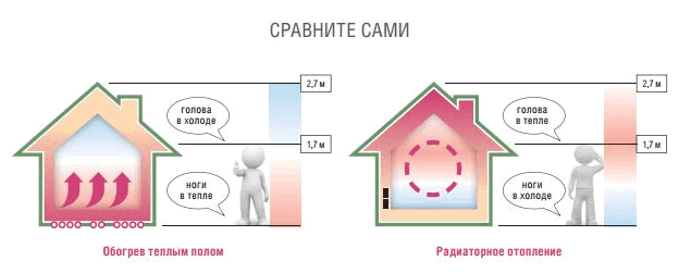 Keinotekoisesti tiettyyn lämpötilaan lämmitetystä lattiasta tulee tehokas lämmönlähde huoneessa. Suuren lämmitysalueen ansiosta ilma lämpenee tasaisesti ja nousee ylös täyttäen koko sisätilan. Ilmanvaihtoprosessi tarjoaa vaaditun huonelämpötilan ja lisäksi minimoi sen erot lattian tasolla ja katon alla. Huoneissa, joissa on lämmin lattia, ei käytännössä ole alueita, joissa on viileää ilmaa.