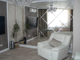 Екран с отразяващи врати ще бъде отлично решение за разделяне на стая на зони. Визуалният ефект ще се променя всеки път, когато клапите се сгънат. Екранът ще изпълнява задачата на миниатюрна съблекалня в малък апартамент и кът-склад с ненужни неща.