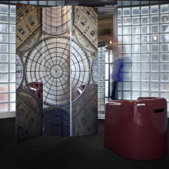 С помощта на голямо вертикално отразяващо платно в центъра и декоративни прегради пред него, разделяйки пространството на зони, можете да създадете фина игра на равномерни геометрични линии и лъчи светлина на малка площ.