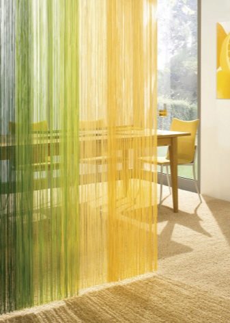 Завесите с нишки са чудесни за зониране на малка стая. Тази опция принадлежи към икономична класа. Те перфектно пропускат въздух и светлина, заемат малко място и по всяко време могат да бъдат премахнати, което прави стаята още по -голяма..