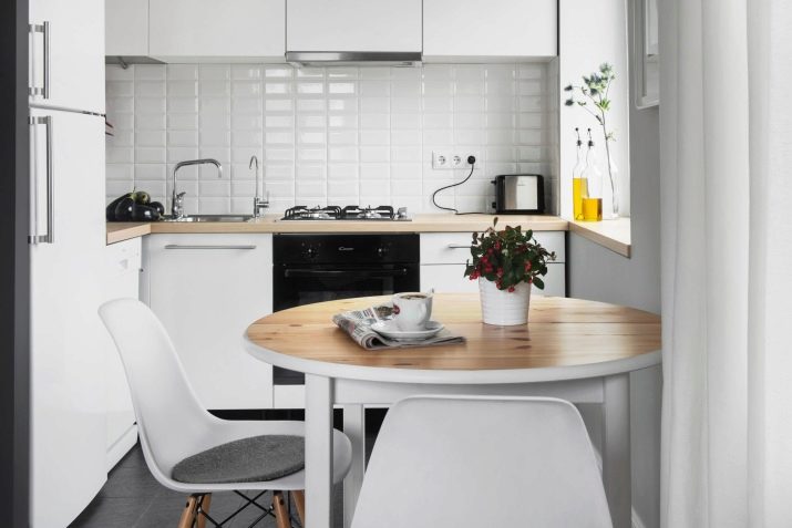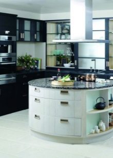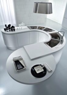 Когато работите върху подреждането на кухнята, не трябва да се страхувате от смели решения. Заоблените слушалки съчетават комфорт, функционалност и стил. Освен това се намира на площ от 8 квадратни метра.