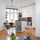 Особеностите на апартамента не правят възможно преместването на кухнята на друго място, но можете да пренесете трапезарията в хола. За да направите това, можете да разрушите преградата между кухнята и стаята или да направите сводест отвор. Такъв широк проход визуално ще раздели пространството и ще създаде ефект на увеличаване на площта. Вместо голяма просторна маса, можете да оставите място в кухнята за бар плот, който може удобно да побере до 4 души.