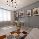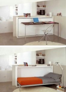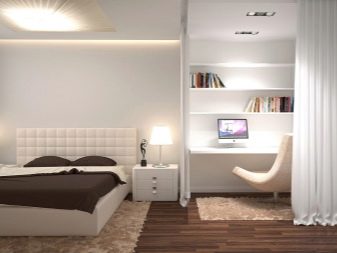 - Кабинет-спалня. В този случай работният плот може да бъде поставен по -близо до прозореца, като се използва стена от гипсокартон или стелажи. Също така, с помощта на осветление, можете да разделите стаята на две независими функционални зони..