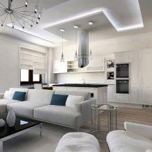 Най -лесният начин да завършите тавана в малък апартамент е да използвате опция за разтягане. Той ще скрие всички недостатъци, нередности и пукнатини. Можете също да използвате многостепенни тавани с допълнително LED осветление. Допълнителното осветление по периметъра на тавана визуално ще увеличи дължината на стаята.