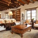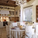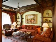 Всички мебели са изработени от естествено дърво, чиято текстура позволява наличието на ожулвания и пукнатини, придавайки на продуктите определена древност. Неговият солиден и елегантен външен вид е доста запомнящ се и предизвиква много положителни впечатления сред другите. Като декорация се използват стъклени и керамични фигурки. Заслужава да се отбележи, че всяка мебел се характеризира с функционалност и естетическа красота, което прави стаята възможно най -удобна за вашия престой..