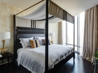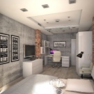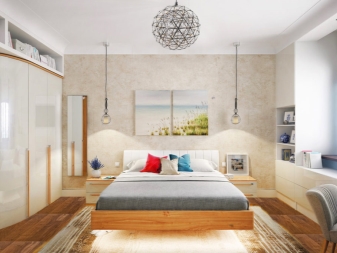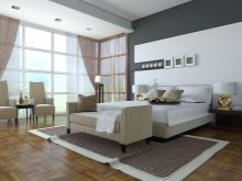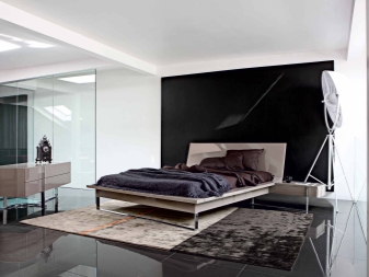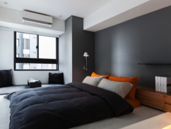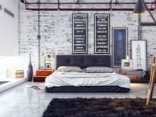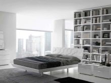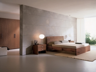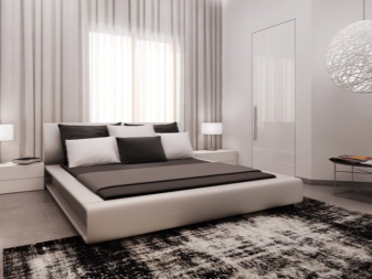 Стените на стаята са боядисани в един цвят или залепени с тапети в бежови, сиви или пясъчни нюанси. Декорациите са черно -бели фотографии или картини с абстракции. Този тип дизайн е много динамичен, така че тук се използва всичко ново и модерно. Мебелите се характеризират с геометрия и строгост на линиите. Леглото се счита за задължителна мебел, но обемните гардероби се заменят с модерни и функционални стелажи с много рафтове. Като цяло интериорът изглежда прост, но много елегантен..