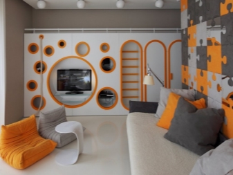 Този дизайн на стаята се характеризира с такива характеристики като ясна изразителност и сбитост в почти всичко. Мебелите в този стил са изработени от пластмаса, метал, както и стъкло и имат невероятна функционалност. При декорирането на стените не се допускат твърде ярки нюанси, така че тук приоритетът е бяло, сиво, черно и кафяво. Таванът може да бъде окачен или окачен, върху който са разположени прожектори. Килимът е положен на пода, което придава на стаята особен уют и комфорт.