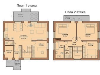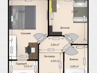 Друг популярен вариант на оформление е разположението на две спални на втория етаж и една на първия. На долния етаж можете да оборудвате спалня за възрастни родители или стая за гости. Обикновено в близост има баня или тоалетна. Има и място за тясна съблекалня. От спалнята на втория етаж можете да направите изход към малък балкон.