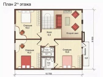 В стая до 100 м2 е по -добре да преместите всички стаи на втория етаж. Това е доста удобно решение, тъй като по този начин къщата може да бъде разделена на две основни зони..