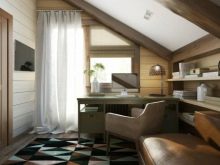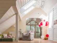 Първият е през деня, а вторият е вечер. В такава къща горе винаги е тихо и спокойно.. Стая с такова оформление ви позволява да разпределите място на приземния етаж за гараж или творческа работилница с интересен дизайн.