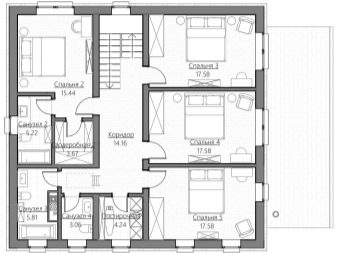 Такъв проект ви позволява да отделите зоните за отдих от шумните зони. В този случай всички спални са разположени от едната страна на къщата, а кухнята и холът са на отсрещната стена.. Това оформление е чудесно за правоъгълни или квадратни къщи.. Животът в такива условия ще бъде удобен както за малки, така и за големи семейства..