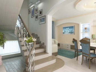 Такива структури винаги изглеждат стилни.. Стълбището може да бъде основният елемент на дизайна. Изпълнява се в различни техники, което ви позволява да придадете на интериора уникален и много красив вид..