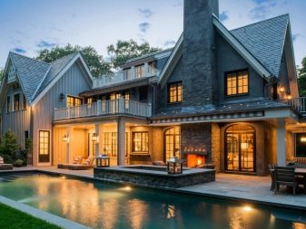 Ако отдавна мечтаете да построите двуетажна къща в американски стил, трябва да се запознаете с нея по-подробно.. Тази посока може лесно да бъде разпозната по симетричната си форма и ниската основа.. Що се отнася до околностите, мястото винаги е спретнато и подредено и е разделено на зони за деца, барбекю и, ако е възможно, басейн. Пред фасадата има красива морава с цветна леха и спретнато окосена морава. Често такива къщи могат да имат просторни веранди, тераси или веранди. трябва да бъде отбелязано че отличителна черта на американския стил е наличието на прикрепен просторен гараж.
