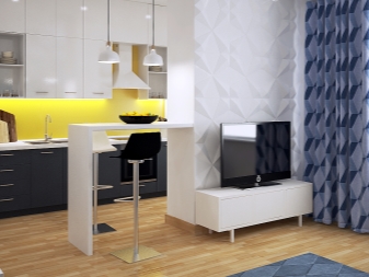 Не се препоръчва поставянето на прегради в такава стая, те не само ще „отнемат“ зоната, но и ще изглеждат нелепо. Можете да извършите зониране в кухнята с помощта на бар брояч, той ще служи като заместител на обикновена маса и ще раздели пространството на място за почивка и трапезария.