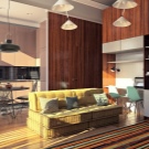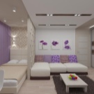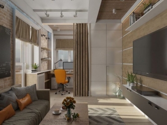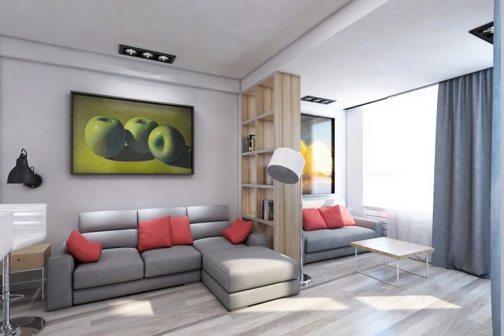 В допълнение, в апартаменти с такава площ могат да се използват специални прегради за разделяне на пространството на отделни секции. Комбинацията от довършителни материали също изглежда оригинална в съвременния дизайн, например, едната област може да бъде покрита с ламинат или паркет, а другата може да бъде покрита с килим.