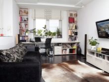 Трудно е да се оборудва пълноценна работна зона в едностаен апартамент, но ако се постараете, можете да изберете малък ъгъл, където ще бъде удобно да работите. Например, перваза на прозореца може лесно да замени всяко бюро. Чекмеджета и рафтове за офис консумативи и хартии ще бъдат компактно поставени под него. Единственото, което е необходимо, е да се предвиди разположението на изхода.