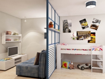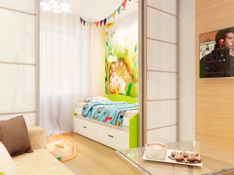 Семействата с деца често трябва да живеят в едностайни апартаменти. Ето защо, когато проектирате дизайна на такова жилище, е важно да се погрижите за наличието на отделно място за детето, където то да може удобно да учи и да играе. За максимално удобство детската зона по правило се прави в най -светлата и слънчева част на стаята..