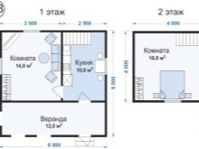 Често малки селски къщи се правят на два етажа.. На първо ниво най -често организират хол (площ – 8-10 кв. М), кухня. На втория етаж има спалня с малка баня.