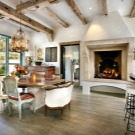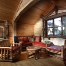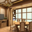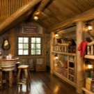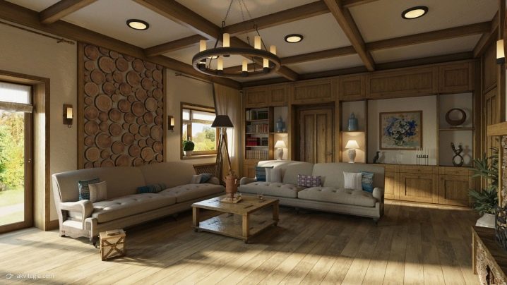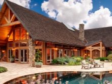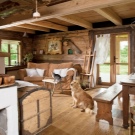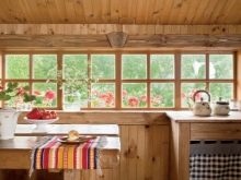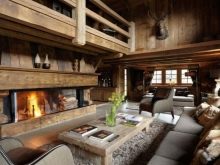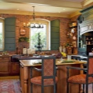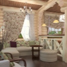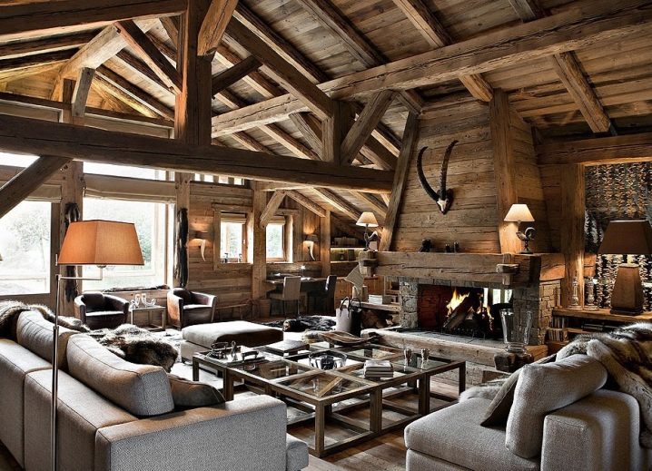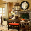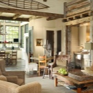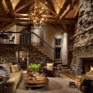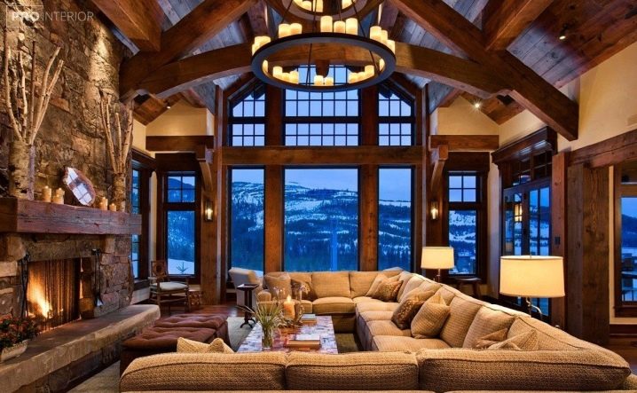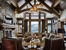 Това са големи и светли помещения, масивни греди и изобилие от дърво. Вътрешната декорация на стени практически не се изисква, просто трябва да обработите дървото, придавайки му желания нюанс, съчетан с цвета на избраните мебели. За декоративни вложки можете да изберете естествен или изкуствен камък. Елементите на мебелите и декора са доста прости, не са претоварени с детайли..