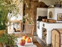 Дизайнът на кухнята на селска къща трябва да се припокрива с дизайна на хола. Поне някои от мебелите трябва да бъдат изработени от дърво или с дървени фасади. Таваните са покрити с боя на водна основа. За декор са избрани фаянс, текстил и естествени материали. Дантелени завеси и килим на пода перфектно ще допълнят интериора.