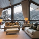 Оформлението на къщата в стил хижа е доста необичайно, защото повтаря оформлението на ловните хижи в Швейцария. За украса на пространството се избират рога, кожи, пълнени птици и животни и други трофеи. Стените трябва да бъдат завършени с камък, мебели – предимно в тъмни цветове, има голям брой ковани елементи.