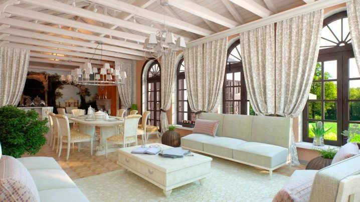 Стилът включва топли, прости цветове, тухла и декоративен камък. Текстилът е украсен с голям чек и изображения с пачуърк. Изискват се камина и мебели в пастелни нюанси. Изолираната веранда ще ви позволи да оборудвате друга стая – да я превърнете в трапезария, библиотека или кабинет. Допълнете пространството с люлеещи се столове, маси за кафе и килими с дълбоки купчини.