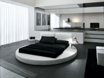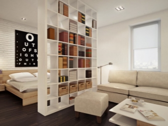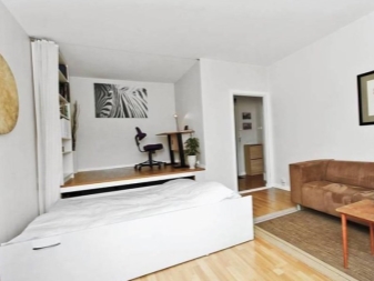 За да направите стаята удобна, в такива студиа изисква се зониране. За да подчертаете зоната за спане или почивка, можете да инсталирате легло, оградено с екран. Използването на конструкции от плексиглас или гипсокартон стана широко разпространено при създаването на прегради. В този случай трябва да се даде предимство на стъклени повърхности, които не пречат на разпространението на светлината..