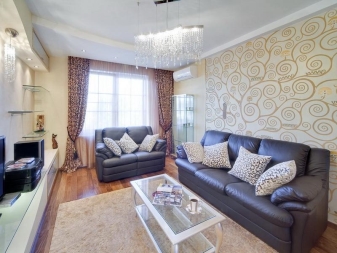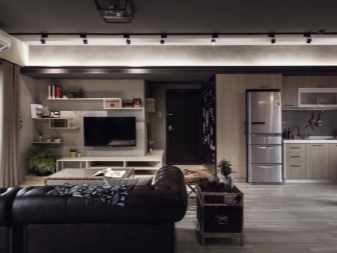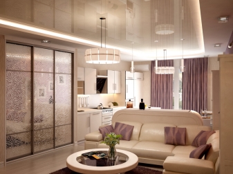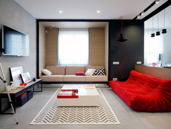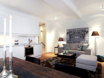 Почтеността е основното нещо в интериора на такъв апартамент. Голямо внимание се отделя на цветовата комбинация и подреждането на мебелите. Съблекалнята е отделена със специални плъзгащи се врати. Зонирането се извършва с помощта на платнени завеси. Огледала за визуално разширяване на помещението са монтирани срещу източници на светлина.