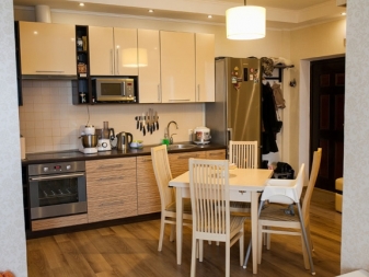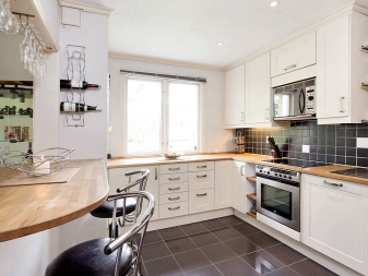 Вградените уреди спестяват място. Например фурната е вградена в кухненски комплект, а не под котлона. Такива вертикалното разположение заема по -малко място (в сравнение с хоризонталното разположение). Стаята служи като работна и кухненска зона едновременно. Бар плотът служи като своеобразна преграда за мед в тези райони. Тъй като дневната е комбинирана с кухнята, има припокриване в стил и цвят..