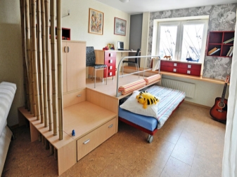 Подиумът е подходящ за необходимостта от създаване на две удобни пълноценни спални в една стая. Тази опция е подходяща за семейства с тийнейджър или двама приятели. В този случай едно легло е разположено на подиума, а под него е монтиран разтегателен гардероб. Подиумът визуално разделя зоните за спане и подобрява пропорциите на стаята. Но той също толкова лесно може да затрупа стаята..