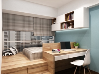 Всеки квадратен сантиметър е включен в този интериор. Подиумът наскоро стана широко разпространен в дизайна. Такива интересни дизайни ви позволяват да модифицирате пространството и да увеличите неговата полезна площ. Работният се намира в горната част на подиума и самият той действа като разтегателно легло. Благодарение на второто ниво, в космоса останалият ъгъл е отделен от общия обем на стаята.