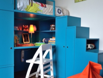 Често семействата с деца трябва да разпределят пространство за игра и учене. Например, за да разделите стаята на две части, можете да инсталирате детски килер за съхранение на играчки и дрехи. Тази ограждаща структура изпълнява няколко функции едновременно. Ако тази опция е невъзможна за изпълнение, дизайнерите се съветват да закупят таванско легло, под която можете да поставите ученическо бюро или диван. Тази техника е подходяща не само за студио, но и за апартамент с жилетка..