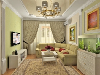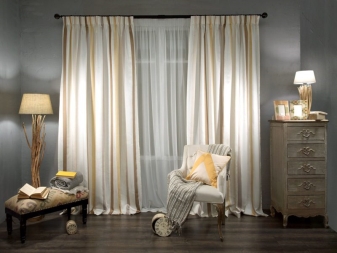 В стаи с големи прозорци можете да използвате завеси от лека палитра от ефирни тъкани. Дизайнерите съветват да изберете завеси, които лежат малко на пода. Обемните тежки завеси, както и многослойните конструкции в тесни пространства, изглеждат неуместни. Тъканта с вертикални райета добавя височина към пространството. Използването на студени нюанси визуално ще удължи стаята..