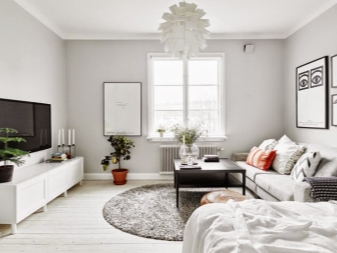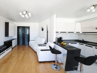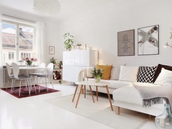 В такива апартаменти нищо не пречи на свободното разпространение на слънчева светлина, което визуално увеличава апартамента. Мебелите играят ролята на елементи за зониране. Важно е да запомните това в малка стая, същото покритие трябва да се използва във всички функционални зони.