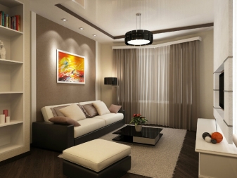 Можете да допълвате такъв интериор със скрити лампи, вградени в тавана.. Цветът на завесите трябва да бъде избран според цвета на стените., така че интериорът да изглежда напълно хармонично.