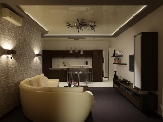 Добре обмислената система за осветление играе важна роля за създаването на комфорт. Светлината може значително да разшири пространството, което е безспорен плюс за малките стаи. Разрешено е използването на различни видове осветителни тела, ако те са хармонично интегрирани в интериора на интериора. Функционалността на отделните зони ще бъде подчертана от локалното осветление. Всяка зона има право да използва отделен тип осветление.