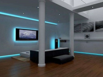 Горната схема е близка до естественото осветление и е най -физиологичната. Има няколко новости за визуално увеличаване на пространството с помощта на светлина. Стаята може да бъде удължена чрез подчертаване на една от стените със студената част на спектъра. Неговото подчертаване ще помогне за повдигане на тавана, а вградената в тях светлина ще помогне за преместване на стените..