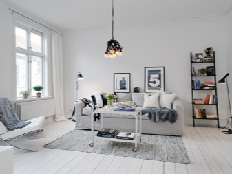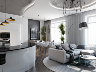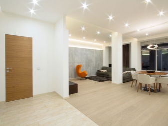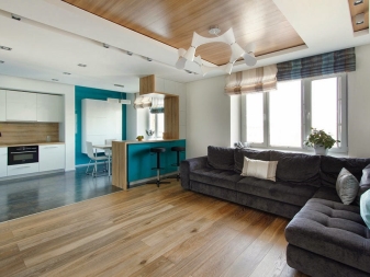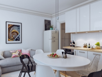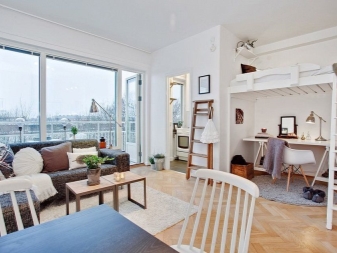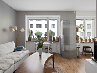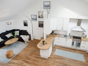 В такива апартаменти нищо не пречи на свободното разпространение на слънчева светлина, което визуално увеличава апартамента. Мебелите играят ролята на елементи за зониране. Важно е да запомните това в малка стая, същото покритие трябва да се използва във всички функционални зони.