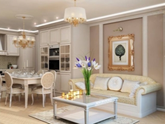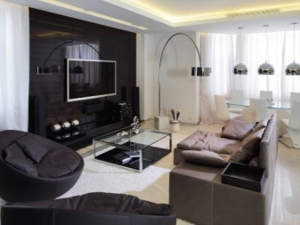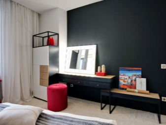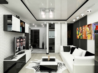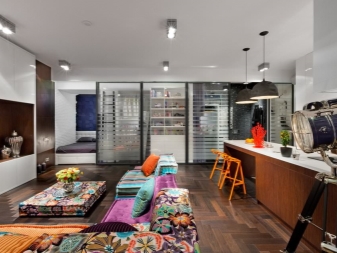 Почтеността е основното нещо в интериора на такъв апартамент. Голямо внимание се отделя на цветовата комбинация и подреждането на мебелите. Съблекалнята е отделена със специални плъзгащи се врати. Зонирането се извършва с помощта на платнени завеси. Огледала за визуално разширяване на помещението са монтирани срещу източници на светлина.
