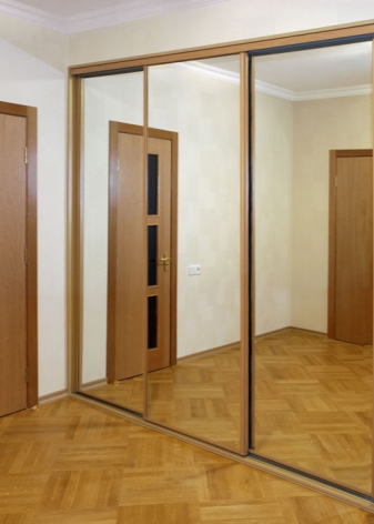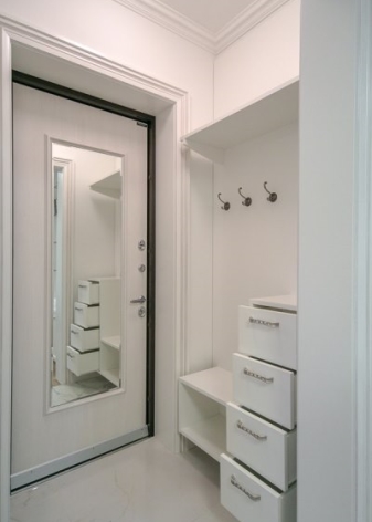 Важно изискване за коридора в едностаен апартамент е разположението на килера с дрехи. Ако вратите на съблекалнята са облицовани със стъкло, стаята ще изглежда по -просторна. Огледална входна врата не само ще създаде илюзията за дълъг коридор, но и ще завърши външния вид. Ако банята не позволява инсталирането на пералня, рационално го извадете и вградете в килера.