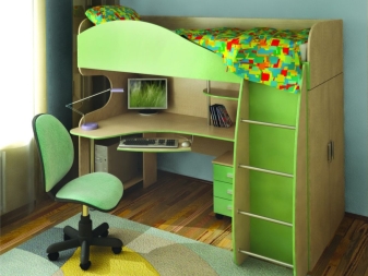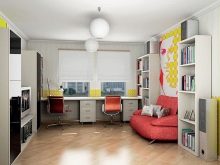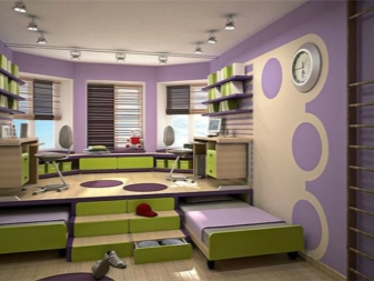 Често семействата с деца трябва да разпределят пространство за игра и учене. Например, за да разделите стаята на две части, можете да инсталирате детски килер за съхранение на играчки и дрехи. Тази ограждаща структура изпълнява няколко функции едновременно. Ако тази опция е невъзможна за изпълнение, дизайнерите се съветват да закупят таванско легло, под която можете да поставите ученическо бюро или диван. Тази техника е подходяща не само за студио, но и за апартамент с жилетка..