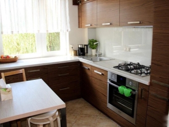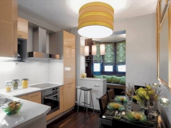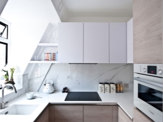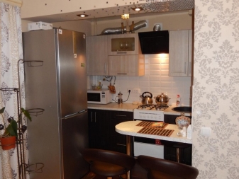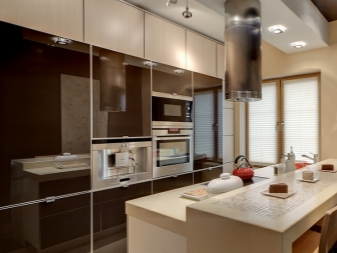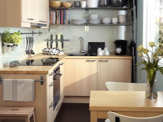Вградените уреди спестяват място. Например фурната е вградена в кухненски комплект, а не под котлона. Такива вертикалното разположение заема по -малко място (в сравнение с хоризонталното разположение). Стаята служи като работна и кухненска зона едновременно. Бар плотът служи като своеобразна преграда за мед в тези райони. Тъй като дневната е комбинирана с кухнята, има припокриване в стил и цвят..