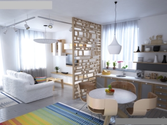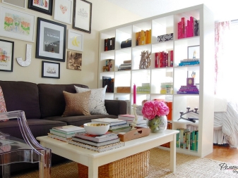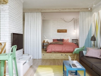 За да направите стаята удобна, в такива студиа изисква се зониране. За да подчертаете зоната за спане или почивка, можете да инсталирате легло, оградено с екран. Използването на конструкции от плексиглас или гипсокартон стана широко разпространено при създаването на прегради. В този случай трябва да се даде предимство на стъклени повърхности, които не пречат на разпространението на светлината..
