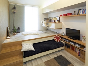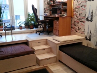 Подиумът е подходящ за необходимостта от създаване на две удобни пълноценни спални в една стая. Тази опция е подходяща за семейства с тийнейджър или двама приятели. В този случай едно легло е разположено на подиума, а под него е монтиран разтегателен гардероб. Подиумът визуално разделя зоните за спане и подобрява пропорциите на стаята. Но той също толкова лесно може да затрупа стаята..