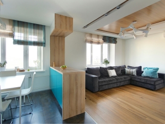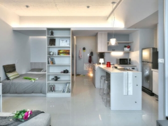 Трябва да се помни, че мебелите играят важна роля в зонирането на пространството. Следователно инсталирането на бар-преграда ще помогне да се отдели кухнята от хола или спалнята. Гардеробите с огледални фронтове визуално ще направят стаята по -широка. Свободните повърхности трябва да се използват максимално, но не трябва да се допуска затрупване.