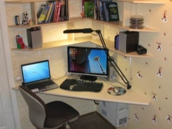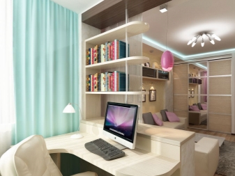 Можете да комбинирате работно и спално място: инсталирайте подиум. В него се помещава работна зона, а под него е легло, което се изплъзва навън с помощта на колела. Такова решение днес се счита за нестандартно и по-скоро креативно. По -традиционна версия на подиума е плъзгащи и повдигащи плотове. В стая с ниша няма нужда да монтирате рафтове: рафтовете могат да се поставят в отвора на стената.