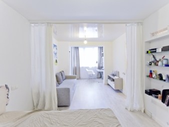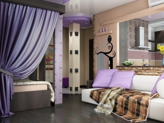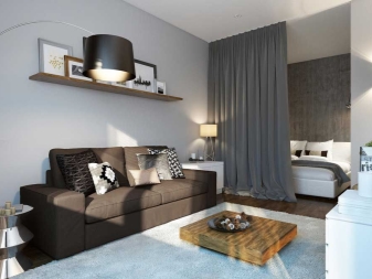 Друг важен момент – отделяне на зоната за спане в апартамент с една стая. Ако размерите позволяват, можете напълно или частично да оградите леглото с помощта на преграда от гипсокартон. Има няколко варианта за превръщане на 1-стаен апартамент в двустаен (например инсталиране на мебели, рафтове или стелажи). Плъзгащите се врати се използват и за отделяне на спалнята, но този метод не винаги е достатъчно удобен. Дизайнерите съветват да се даде предпочитание на завеси с нишки, които създават външния вид на отделна стая, без да претрупват пространството..